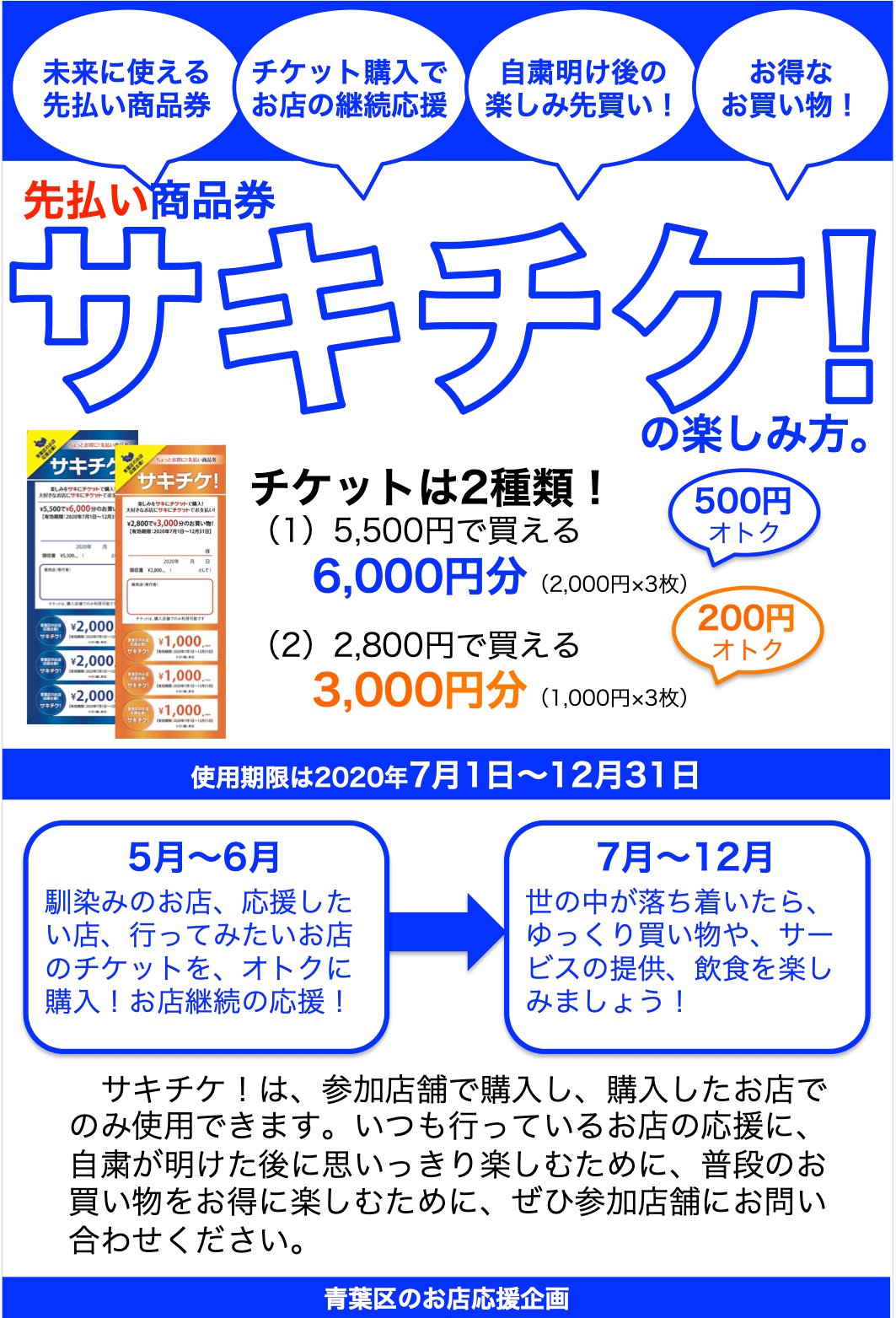 あざみ野商店会では、先払い商品券「サキチケ!」をスタートさせました。「青葉区のお店応援企画」として、区内各地の商店会の皆さんと協力しながら、7月〜12月に使えるお得な商品券を各参加店舗が発行し、お客様にお得な買い物を楽しんでいただきたいという企画です。