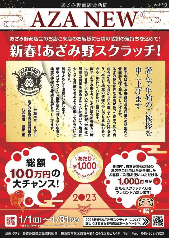 期間中、あざみ野商店会加盟店でお使いいただける1,000円チケットが当たるスクラッチカードをプレゼントいたします。