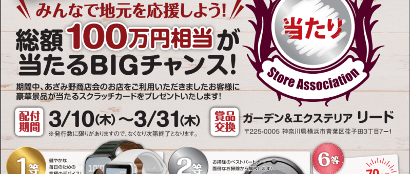 総額100万円の大チャンス! 期間中、あざみ野商店会加盟店でお使いいただける1,000円チケットが当たるスクラ…