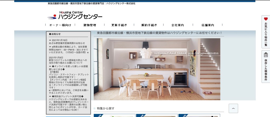 よみ:はうじんぐせんたーかぶしきがいしゃ あざみのえいぎょうしょ業種:不動産業加盟店カテゴリー:不動産業電話番号:045-909-6161所在地:新石川1-6-2 営業時間:10:00〜18:00定休日:第1.3火曜日・毎週水曜日(1~3月は毎週水曜日のみとなります)公式サイト:http://www.housing-center.co.jp お店からのメッセージ あざみ野商店会のグーグルマップが完成しました。 (3/2/2021) 関連