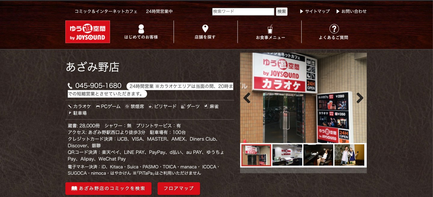 よみ:ゆうゆうくうかん あざみのてん業種:カラオケ ダーツ 麻雀 ビリヤード コミック加盟店カテゴリー:飲食店電話番号:045-905-1680所在地:あざみ野1-9-15 営業時間: 24時間営業 ※カラオケエリアは当面の間、20時までの短縮営業とさせていただきます。定休日:なし公式サイト:https://yuyu-kukan.com/shop/azamino.htmlLINE@: https://page.line.me/lyo3235y お店からのメッセージ 関連記事 関連